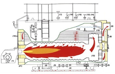 WNS系列全自動燃油(氣)蒸汽鍋爐(實用新型專利),采用臥式三回程濕背結構,改善鍋爐運行環(huán)境,提高鍋爐效率和使用壽命;全部煙氣通道置于水中,尾部配有余熱水箱及完善的保溫外包設計,煙箱密封采用迷宮式結構,避免了煙箱漏煙現(xiàn)象。工作原理如下圖所示: